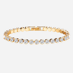 Ta elegancka bransoletka tennisowa ozdobiona jest lśniącymi kryształami, które nadają luksusowy i ponadczasowy wygląd. Wykonana ze stopu metali i kryształu, dostępna w kolorze złotym i srebrnym, stanowi piękny wybór na śluby, przyjęcia lub jako prezent dla wyjątkowej osoby. Bransoletka lekko układa się na nadgarstku i podkreśla każdy styl elegancją.